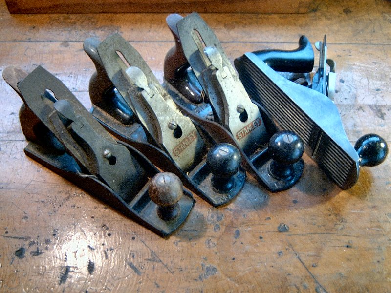 Stanley bench planes, unless otherwise noted. Used for smoothing and surfacing of wood, and edge jointing preparation.