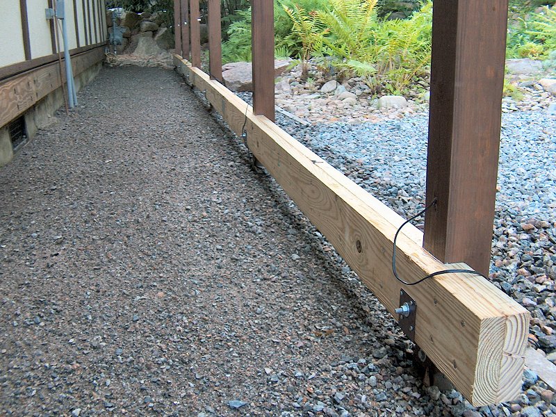 Installing the posts and beams was a bit slow, since the footings aren't perfectly level and the side of the house is pretty wavey. The method to get them in the right place was to carefully get the corner post installed at the correct distance from the house and proper height, then temporarily installed the next post and use the 6 foot level to mark the length and beam location on to it. This process was repeated down the length of the engawa to ensure the posts were plumb and the beam was level, even though the house isn't. Before moving on to the roof installation, I re-stained everything, graded the grey pack, and re-painted the visible connectors to make them less noticeable.