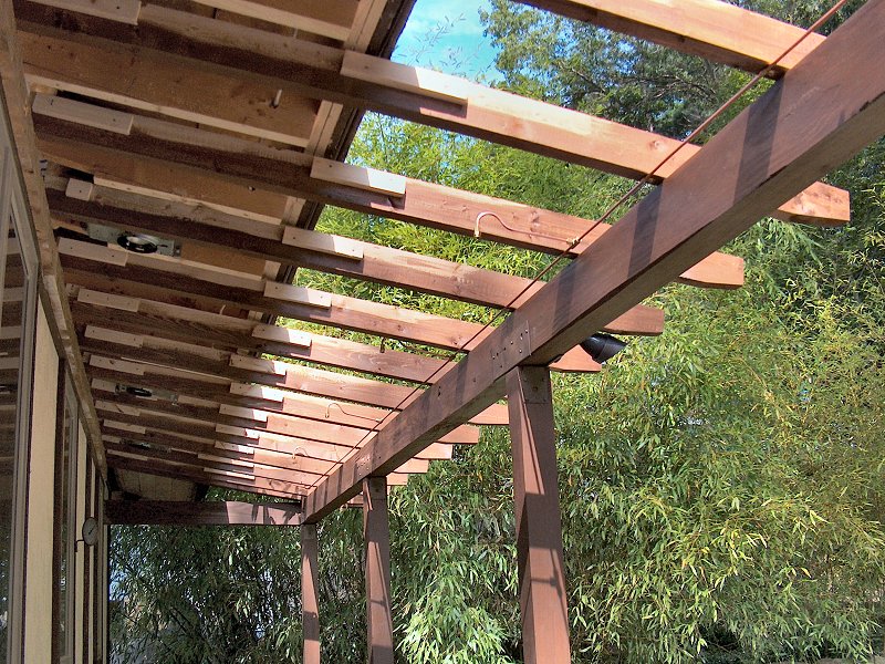 An engawa is a covered, narrow wood-decked veranda, traditionally built with a series of amado sliding wooden doors or shutters which may be used to secure the house and protect the engawa during inclement weather (since the traditional shoji can do neither). The engawa acts as an extension to the interior living space, with a roof to protect it as well as provide additional shade over the home's doors and windows for a cooler interior in the Summer. Because our engawa is going on the North side of the house, the shading isn't a factor, although we still intend to roof the engawa to protect it from the weather (and it would look kind of silly without a roof). The engawa roof sheathing will be attached to the under-side of the existing roof rafters, which is why there is currently just inexpensive plywood on the soffits in that area. We also have no plans to install the amado doors, although there is enough space that we could add them later, as well as a proper tobukuro shutter storage compartment down at the West end of the engawa.