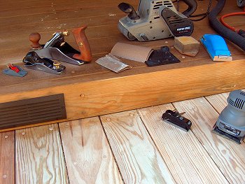 After a couple days for the glue to fully dry, it was time to clean off all the little plug tops and get all the surfaces ready for stain. I gathered a combination of hand planes, hand sanders, and power sanders for clean-up tasks, with 100 grit in the belt sander and 150 grit in the finish sander and hand sanding blocks. The planes worked extremely well to remove the plugs, as well as do a little joint and trim board clean up on the main area of the tsukimi-dai . Things slowed down a bit as I worked my way into the joint between the tsukimi-dai and the engawa trim. When there wasn't enough room for the No. 4 smooth plane or even the No. 60½ block, I'd turn to the little No. 100 block and the No. 75 bull nose to get at the plugs near the inside corners. After planing the plugs off a section, I used the belt sander to do some clean up, and then gave everything a final pass with the finish sander or hand sanders to help blend the rounded board edges with the freshly planed and sanded faces. Working around the posts on the engawa also required the small planes and was slow going, but after about a week of crawling around with hand planes and power sanders, the job was finished. I think we were both a bit surprised at how well everything turned out, and very glad we'd made the decision to counter sink and plug all the deck fasteners, rather than have a deck covered with exposed screw heads. At long last it was time to get some stain on this thing.