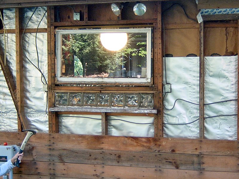Other than a little damage to a couple studs from an old leak behind the shower, I didn't have to deal with re-building the entire wall to install the new kitchen and bathroom windows. Getting the spacing just right required some careful measuring and cutting of the old wall studs, but installing these 2 windows was otherwise uneventful.