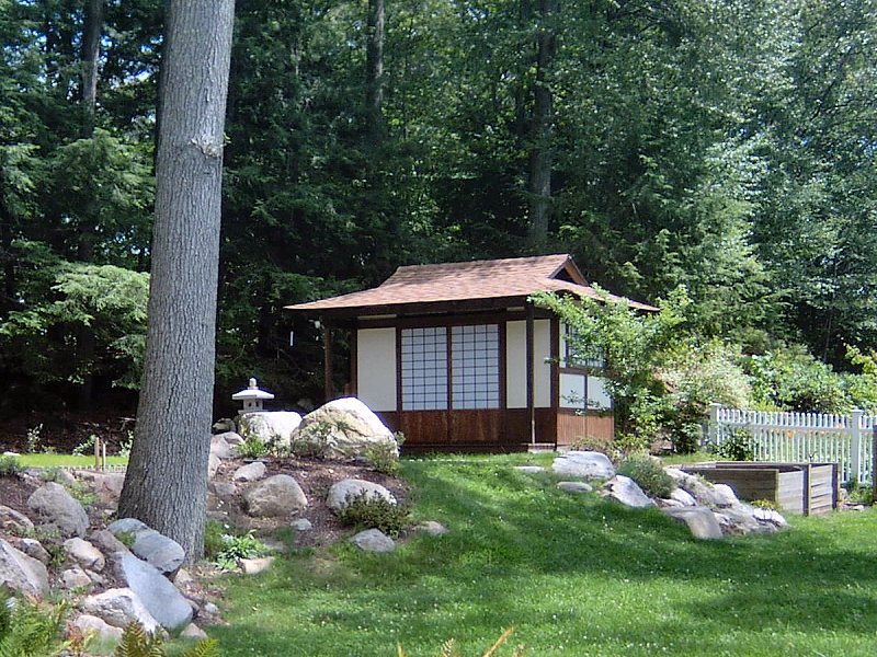 While not an elegant name (garden pavilion sounds much nicer, but it is just a shed, after all), the shed was the first construction project I built on the property after the landscaping was finished in late Summer, 2003. I hadn't done any construction work for nearly 20 years, so I decided the shed would be a good starting point for a little carpentry refresher course. The shed was built without using any nail guns, since I wanted to at least try doing it "old school" before investing in an air compressor and nail guns. I also didn't make any plans for the thing (other than a few rough sketches of course), and just sort of designed it as I went along. I had an idea of how I wanted it to look, and not having a set of plans to work from allowed me to modify the design as I remembered how to build walls and frame window and door openings. I also wanted to use the shed as a sort of "test case" for the changes I had in mind for the roof on the main house, so I planned it with a 5:12 main roof pitch and a 3:12, 2 foot wide overhang to see how that would look.