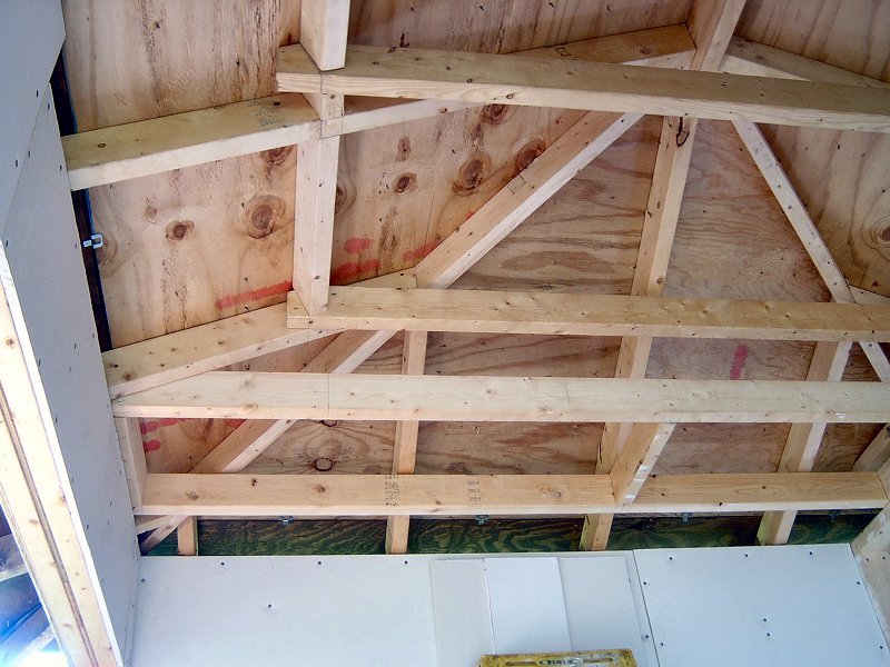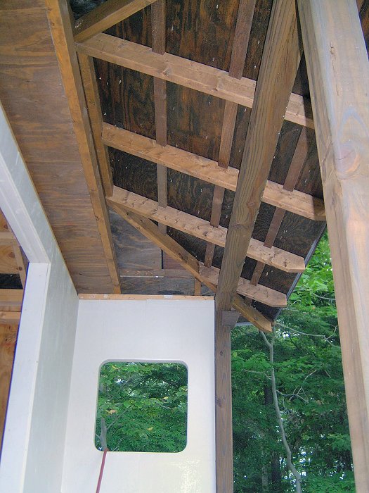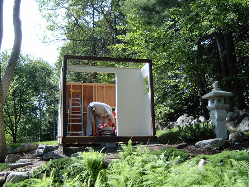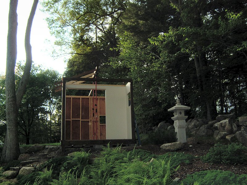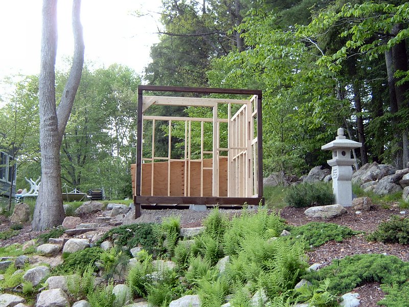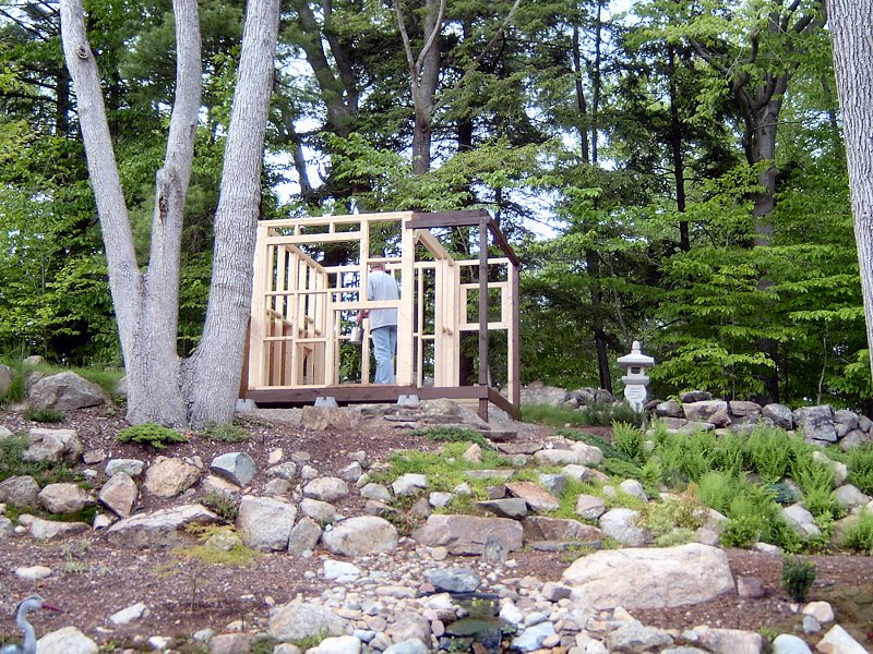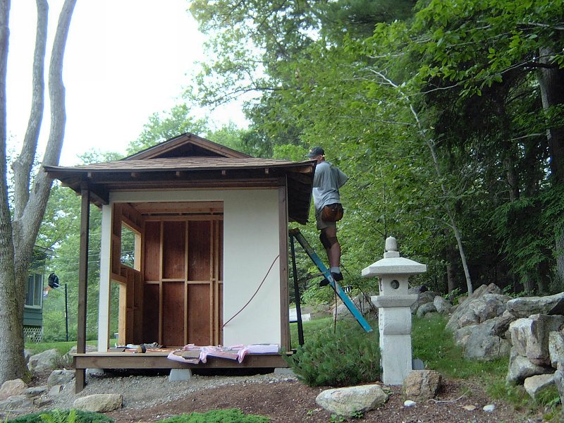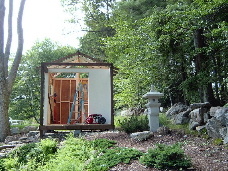 I planned to have 2 garden sheds in the original landscape design: the 9' x 12' garden shed in the Northeast corner of the yard for garden tools, and a smaller 8' x 8' shed in the Northwest corner that we'd use to store pond supplies. After the potting shed was finished and I began planning the other shed, I designed the outside to look like a chashitsu, or Japanese style tea house but the interior was just going to remain unfinished with some shelves, like the potting shed. It wasn't until I actually began construction on the building that we decided to go ahead and finish the structure as functional tea house, rather than just another fancy tool shed. Another factor in the decision to finish the interior of the structure was that by this time (Summer 2005) we had decided that my full time work would be the home renovation project, so I also thought it would be a good idea to create a little retreat for the lovely bride to come home to after her day at the office, rather than have to face the mess of the ongoing home renovations every night.