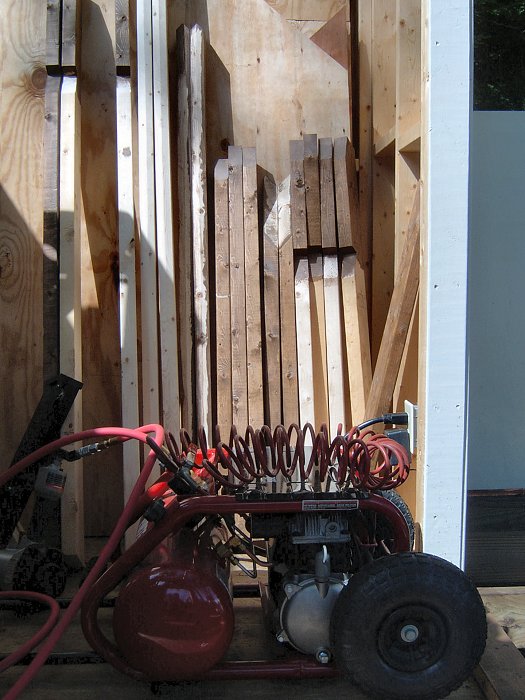 The site for the tea house had been prepared at the same time as the other shed's site, with the same 6 inch deep bed of gravel well compacted with the Bobcat. Unlike the potting shed however, I had no intention of just "wingin' it" with regard to the planning and framing of the tea house. Although our yard is small, the prospect of humping lumber and tools up and down the hill hundreds of times over the course of the project did not sound very appealing. Instead, I took the time to plan out all of the framing ahead of time and prepare detailed cut lists. The idea was that I'd pre-cut all of the lumber down at ground level (we have a 12' x 20' temporary storage building that I've been using as a shop throughout the renovation project), then carry all the pieces up to the site and assemble them like a big kit. I got a little carried away with the plans (20 pages for a tiny little shed!), but creating the plans was a good exercise for later projects on the main house, and was extremely helpful in building the really goofy teahouse roof. By the time I started tea house construction, I'd also taken heed of the lessons learned during the potting shed construction, and had acquired an air compressor, a few nail guns, and a nice Milwaukee sliding compound power miter saw.