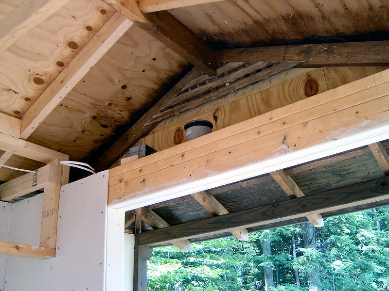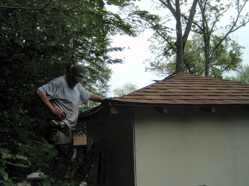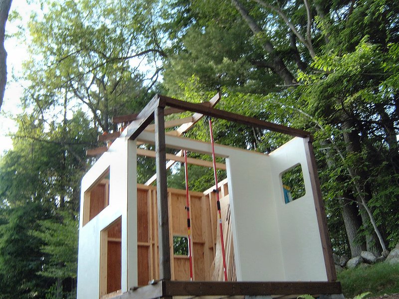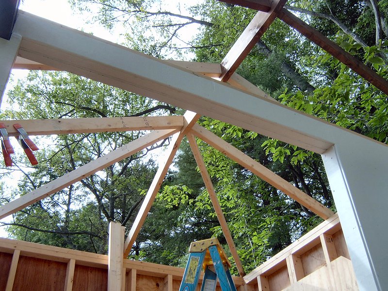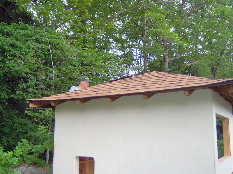 Framing the building moved along very quickly once I got over all the messing about with plans, and the idea of cutting in one location and building in another was working out well. I was able to do all the cutting at the saw station, then haul everything up the hill and frame each section without a bunch of trips back and forth. I had power up at the site already, since I put the electrical lines in a few years earlier when we had the septic system installed, so I was able to power up the compressor and bang the walls together in no time with a framing nailer. I was amazed at the difference in speed and ease the nail guns made throughout the teahouse building project. Wall sheathing went on next, then the roof was framed and sheathed. For roofing we used the same style shingles as the potting shed, but this time they went down in a matter of hours rather than days, thanks to the coil roofing nailer.