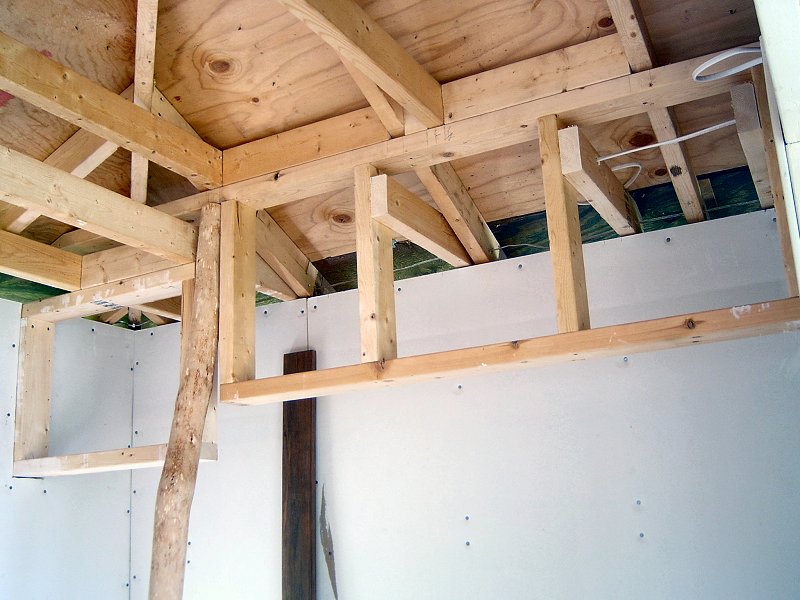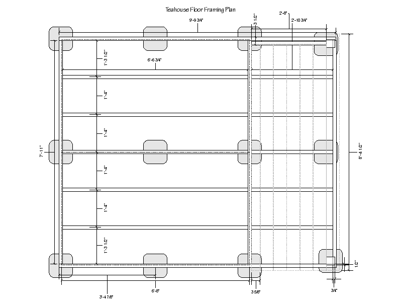 Like the potting shed, I started the teahouse with 16 concrete Dek-Blocks piers on the gravel base, then built the floor from 2x6 pressure treated lumber on 16" centers with joist hangers and decked it with 3/4" exterior grade plywood. Originally the teahouse was going to be 8' x 8', but I ended up changing the dimensions a bit to fit the small site. I wanted to have a small porch on the front of the teahouse like I'd put on the shed, so in order to accommodate a 3' wide porch, the building shrank to 6' x 8' (9' x 8' with the porch). As I was doing the framing, I learned that the 6' x 8' dimensions were ideal for an Ichijo-daime two-mat tea room - a standard tatami mat is roughly 3' x 6'- so at 6' x 8' I could use two mats and still have room inside for the tokonoma (scroll alcove) and mizuyadana (storage area) along one wall. I altered the floor framing to create an area for a ro (hearth or fire pit) as well, as I figured out I was building an actual two-mat teahouse, rather than a pond supplies storage shed.