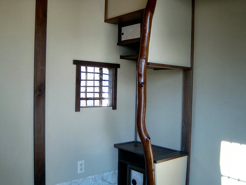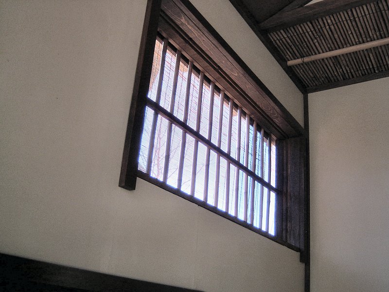 I also employed some of our bamboo to create the loose "screens" that fill the West and North windows for the illusion of a traditional window style where wall openings are simply not filled with plaster mud, and the exposed bamboo "lathe" creates the window screen. I intend to make a pair of yukima shoji for the main doors, which incorporate a sliding section within the shoji that holds a pane of glass - that will be nice to view the garden when seated on the floor inside the tea house. Unfortunately I haven't made the commitment of time necessary to assemble those shoji yet.