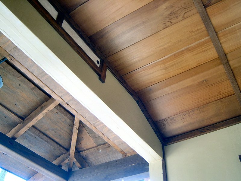 The interior received a full finish with gypsum wall board, a Cedar plank ceiling, and goza mats on the floor (I'll install tatami once I've done the doors and I can close the building to protect them from rain and snow). As we did with the exterior of the shed, we used the interior of the teahouse to experiment a bit with wall and trim colors for the main house. We decided on Valspar's "Prairie Dance", 3006-10A wall color, and Minwax's Water-Based "American Walnut" Wood Stain with their water-based semi-gloss Polycrylic Protective Finish topcoat for the trim.