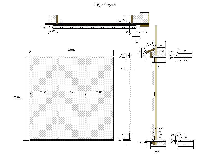 The exterior was finished in the same manner as the potting shed, with "Tobacco" stained rough-sawn trim. I used a couple canes of bamboo from our little stand of bamboo to create the vertical bars on the Southern window, then turned my attention to the crawl door or nijirigushi. Tradition holds that this door should be made from three pieces of wood, and one of them should be a "used" board from the main house. Luckily, I had found a few scraps of 14" wide boards in the attic, so I was able to assemble a right proper little sliding door.