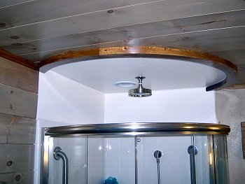 Installation of the Kerdi was surprisingly easy, and after a couple days to ensure the thinset had cured, I started spreading thin layers of plaster over the Kerdi every couple of days. Okay, it's not just "plaster" - I used Georgia-Pacific's DensArmor Cote™ All-Purpose Ready-Mix Joint Compound. After a couple days of this I found something else to do... one can only sand and re-plaster the same 10 sq. ft. of shower walls so many days in a row, ya know. Days turned in to weeks, but eventually I got the shower wall plaster finished to a point where I was satisfied. I primed with Zinsser® "Bullseye 1-2-3" primer, then topcoated with two coats of their "Perma-White Mold & Mildew-Proof™" interior paint. All that plastering and sanding took place over the Summer whenever the weather was right (not too hot, not too humid...), and I finally managed to snap some pics of the finished walls early in the Fall of 2009.