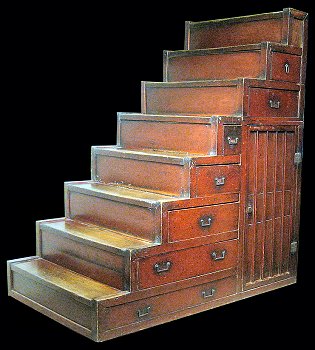 The last tricky bit of the floor plan was allowing some manner of attic storage access in the new plan. The Eastern half of the attic has angle braces nailed in between the rafters and ceiling joists (since there's no bearing walls between the kitchen and living room) so that part's not much good for storage, however the Western half (over the bathroom and bedrooms) is all open space. In order to get up there now we need to use a step ladder, which is no fun. A pull down staircase requires a fair amount of open floor space below it, so that's not something we really wanted to put in either. Luckily,the Japanese carpenters of old figured out a solution to this little dilemma in the form of a stair-shaped storage cabinet called a kaidan dansu or "step tansu". Often used in merchant shops for access to loft storage space, the step tansu is a wonderful piece of furniture that will give us a good amount of storage space just outside the bathroom for bedding and towels, act as a room divider between the main house and the walk in closet, and provide a stable means of getting to the attic when the need arises. Now I just have to build one.