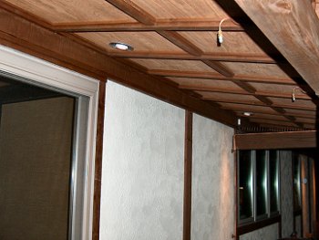 I started by replacing the 50w Halogen PAR20 with a 7w GE® LED PAR20 bulb at 2,700K. The color was good and dimming performance was fine, but the bulb stuck out of the fixture about half an inch (the engawa fixtures are "shallow" cans, as there's only 2x4s for rafters in that roof). Knowing I was going to be adding a bunch of new cans elsewhere in the house, I decided to give a "ceiling light retrofit kit" a try. These kits replace the bulb in the recessed fixture with a new trim and lens unit that has an LED built in to the thing behind the lens, and a bulb socket adaptor and plug for power. They run about $10 or $15 each, so basically the same as a decent LED bulb. I also liked the idea of have a sealed surface for these outdoor cans to keep the bugs out of the fixtures. I began with a single 5,000K fixture and a "color selectable" 3,000k - 5,000K fixture to try them out. Even with the one set to the "warmest" temp., it was still way too "cool"/blue for what we were trying to get, especially when dimmed down.