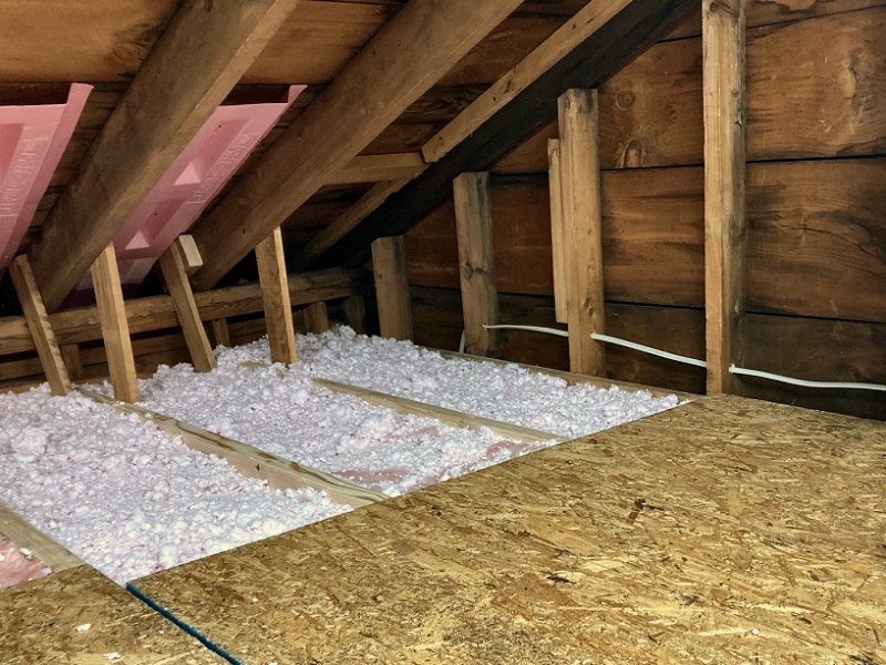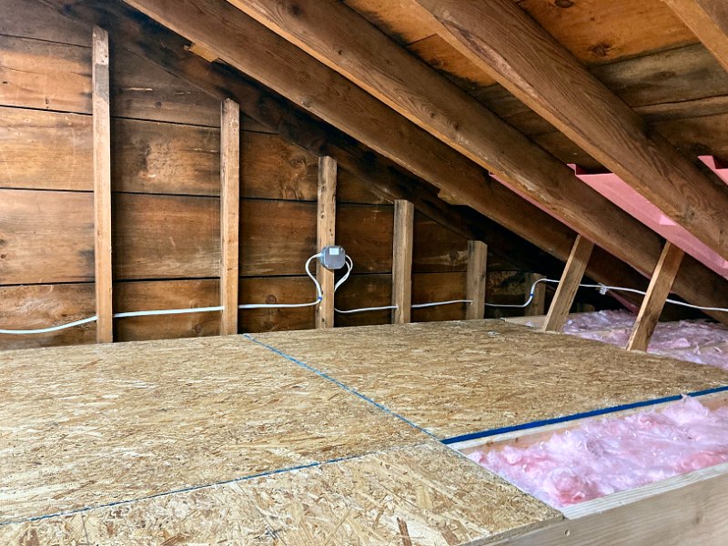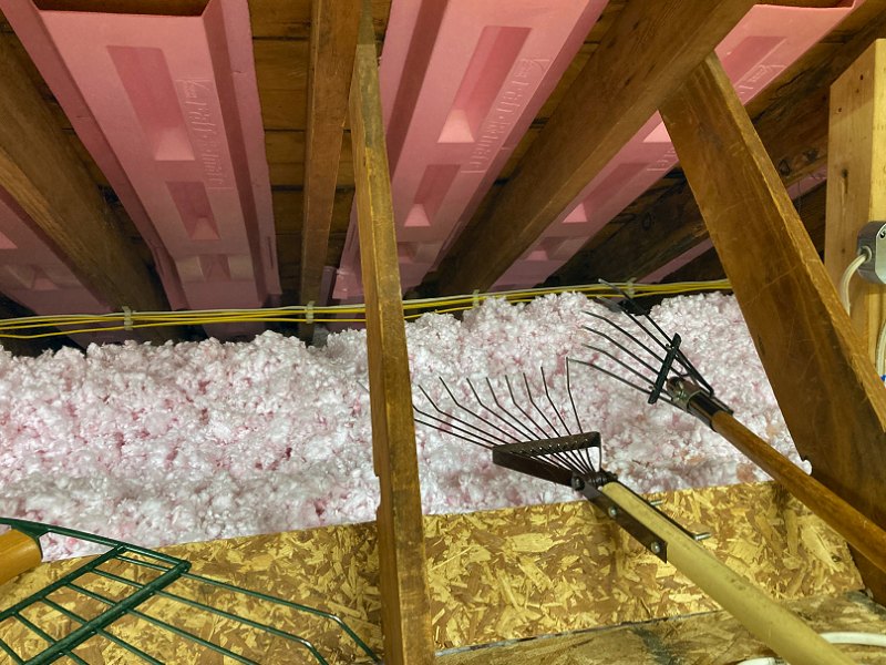 Most of the exterior walls were insulated and covered with plastic by 2018, although the walk-in closet/laundry room remained un-insulated until now. After taking care of all the attic floor work and insulation installation (see below), I was finally able to get the closer/laundry room cleared of everything and take care of the last of the wall insulation by mid-Winter 2023-24. I still need to seal the vapor barrier plastic for living room and bedroom exterior walls, but that's underway now. I ended up having to use the pink stuff for the last of the closet/laundry room wall insulation, as it seems the JM stuff mentioned above is only available by special order in bulk quantities. A little leftover R-13 from the attic, along with one more new roll of the stuff and the wall insulation was finished up without issues.