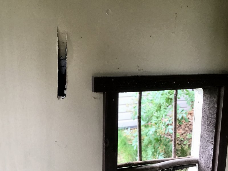 The first thing we found was that there was a small "crater" on the hill right next to the big Red Oak between the deck and the karensansui . The new hole was about 6-inches deep and about a foot in diameter, with the control cable for some of the irrigation valves parted in the center, and mangled up out of the crater with all the wires burnt to a crisp. Perhaps it had hit that big Oak (which has since been removed after a limb fell on the house — Oh, maybe it did get hit and that caused the limb to come down a year later)? We went up into the tea house to see if the other sprinkler valves would still work, and that's when we found the big mess: The sprinkler control valve that had been mounted just inside the door behind a little sliding panel had literally blown apart. All that was left where it had been mounted was the back of the case, with a bunch of burn marks in it. The rest of the controller, along with the sliding door cover and all its trim, had been blown off the wall and scattered around the tea house in pieces.